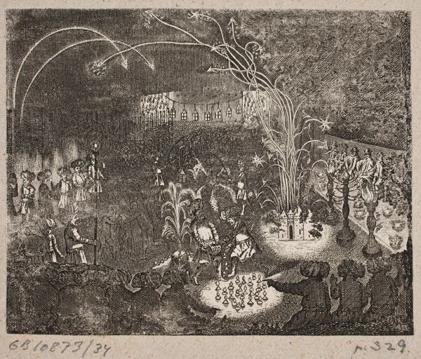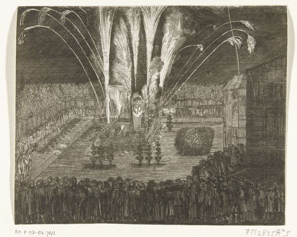 Editor: So, this engraving is titled *Fireworks at Hemissem*, created by Wenceslaus Hollar sometime between 1645 and 1655. I'm immediately struck by the contrast – it feels almost apocalyptic, with the intense light of the fireworks against what looks like a dark, historic cityscape. What catches your eye in this print? Curator: It's fascinating how Hollar captures this public spectacle. Fireworks themselves are ancient symbols, right? Think about it – fleeting beauty born from chaos. They’ve been used for centuries to mark victory, celebrate power, or even ward off evil. Here, that explosive energy seems juxtaposed with the regimented order of the people and architecture. What might this visual tension be conveying, do you think? Editor: Maybe the fleeting nature of power? The fireworks are bright and impressive, but they quickly fade, just like victory or celebration. Curator: Precisely! Consider too the role of fire, a transformative symbol. In some traditions, it represents purification; in others, destruction. Hollar, through this depiction, touches on the complex relationship between celebration and underlying anxieties. This image speaks volumes about cultural memory and how such spectacles leave their mark, doesn’t it? Editor: Definitely! I hadn't thought about the symbolism of fire itself, only the literal depiction of fireworks. Seeing how it relates to wider themes of power and cultural memory is really eye-opening. Curator: And remember, images like this were also early forms of news, communicating events to a wide audience. Hollar isn't just showing us fireworks; he's recording and shaping history. Editor: That adds another layer entirely. I came in seeing an interesting depiction of a celebration, and I’m leaving with a lot to think about concerning power, history, and symbolic meaning. Thanks for shedding light on this fascinating work.
