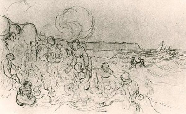 Curator: Just stepping back to take it all in... "Sketches of a Cottage and Figures," Van Gogh, around 1890. Immediately, I’m struck by its restless energy, even in something that feels like a quick study. Editor: Restless is a great word for it. Looking at this drawing—pencil on paper—I'm reminded of how rural labor was represented, and often romanticized, in 19th-century art. There's a focus on the everyday lives of peasants, their connection to the land. It feels almost anthropological. Curator: Yes! And the cottage itself, this… collapsing, almost cartoonish shape in the background! It looks less like a haven and more like another being wrestling with the elements. See how those figures seem to sprout right out of the land, faces obscured, their identities merged with the earth itself? Editor: Absolutely. Van Gogh, even in these preliminary sketches, grapples with social realities and the human condition. Consider how art served both to document and, at times, to invisibilize inequalities, particularly the lived realities of women. Are they part of the landscape or separate? How do social expectations shape these depictions? Curator: I love that questioning. And speaking of expectations... I always expect blazing color with Van Gogh, but here, the somber tones amplify a sense of…starkness. It's like the essence of the scene distilled down to raw emotion, scratching on the page. Editor: True. There is that tension with his vibrant color work. This feels more akin to exploring how labor and rural life intersect with prevailing social structures and ideologies. The sketches prompt questions about access, agency, and how these people were viewed and treated. Curator: It becomes about the artist's internal struggle as much as the scene before him, right? A glimpse behind the curtain, almost uncomfortably so. It pulls me in because, beneath the simple lines, I find layers and layers. Editor: Yes, and that internal struggle—expressed here in charcoal—echoes across time and mediums, linking the artwork to enduring questions about justice, representation, and the dignity of work. It urges us to view his practice as part of a long history of cultural expression. Curator: It's remarkable how even what feels like a fragment can contain such depth. Editor: Absolutely. It prompts essential questions about our relationships to each other.