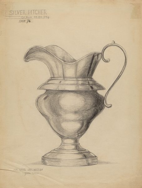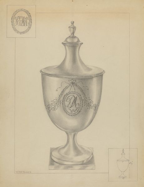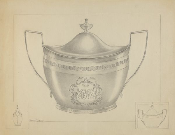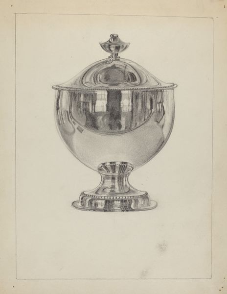 Editor: Here we have Herbert Russin’s "Silver Sugar Bowl," dating back to about 1936, created with pencil and charcoal. It's a very detailed drawing. What’s fascinating to me is how such a mundane object becomes so elegant through the artist’s hand. What symbols or cultural memories do you see reflected in this drawing? Curator: It’s interesting you call it mundane. For me, the sugar bowl itself is rich in symbolism. Sugar, historically, was a luxury, often associated with colonialism and wealth. Consider its presentation within the context of the 1930s. What emotional impact do you feel knowing it was made during the Great Depression? Editor: That's a stark contrast. It does give it a poignant feel, doesn't it? A drawing of luxury during widespread poverty. Curator: Precisely. Notice the monogram in the upper left, possibly identifying the owner or family associated with this bowl. Think about how objects gain symbolic weight. Do you notice how light and shadow seem to create a sense of history and narrative within this object? Editor: Yes, the shading almost gives it a ghostly quality, a relic of a different time. It feels like more than just a study of light on metal; it embodies a certain social history. Curator: Absolutely. Everyday items often carry layers of significance far beyond their practical use, revealing the cultural memory attached to them. It makes you wonder about the story of its owner. Editor: That makes me appreciate the drawing so much more, seeing it not just for its aesthetic qualities but also as a coded artifact from the past. Curator: Indeed. It reinforces the notion that images carry far more than meets the eye and opens up paths to understanding different perspectives on symbols.