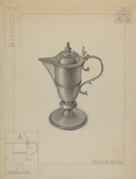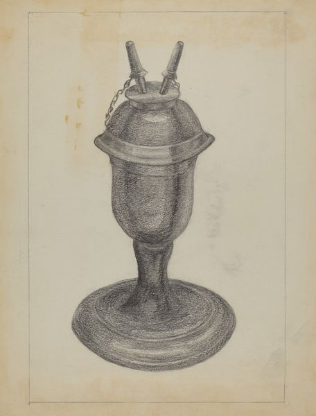 Curator: Welcome. Let’s turn our attention to this delicate pencil drawing. The work, titled "Swinging Lamp," was created around 1936 by Matthew Mangiacotti. Editor: It's striking how precise and… almost sterile it feels. It's as if we’re viewing the object not as an artwork, but more of a study. Curator: Exactly! Mangiacotti, during this period, was employed designing everyday objects, and so what we have here isn’t necessarily intended as high art, but rather a functional blueprint or product design. Notice the faint sketch in the upper left. Editor: You’re right. It looks technical with its dimensions. Considering the economic context of the 1930s, it raises questions about industrial design and the role of the artist. Were such drawings intended to be displayed, or were they purely utilitarian, part of the production process? The materiality—or lack thereof, as a pencil drawing—suggests a prototype rather than a finished luxury good. Curator: That's insightful. And the object itself: this lamp—it speaks to a certain streamlined aesthetic, the influence of modernism even on functional objects intended for mass production. These pieces became accessible to a broader public, shaping their aspirations for the future. The artist isn’t necessarily a visionary genius working in isolation; but becomes another worker within the design-and-manufacturing pipeline. Editor: Yes! And thinking about the making of this work, the controlled marks made from pencil on paper speaks of the constraints and creative solutions to labor in mass manufacturing and art itself. Even the shadows and subtle shading details that give the cylindrical objects its dimensionality requires skillful execution and dedication from the artist. The act of design through this specific medium provides tangible visual context into the processes in factories during this time. Curator: Absolutely, a fascinating intersection of art, industry, and societal aspirations during a transformative era. It highlights the changing role of the artist in the 20th century. Editor: I agree. Thinking about process and the labor helps us better understand this lamp both as a visual item as well as material object that can be examined beyond traditional artistic evaluation.