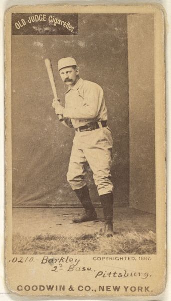 This albumen silver print was produced in the United States in 1887 by Goodwin & Company as part of a series of baseball player portraits used to advertise Old Judge Cigarettes. In the late 19th century, baseball emerged as a hugely popular spectacle and commercial opportunity. Teams such as the Pittsburgh ball club offered a potent symbol of civic pride. This image presents C. M. Smith, the team’s shortstop, as a kind of everyman hero; but its existence as a collectible card also reminds us that sporting fandom has always been bound up with entrepreneurialism. As an advertising premium, this card became a token of exchange, both between consumers and between adults and children. Examining photographs like this helps us to understand the ways in which corporate culture shaped popular leisure and how the consumption of imagery played a role in the forging of cultural identity. To research this further, consider looking through collections of ephemera, advertisements, and early sports journalism.