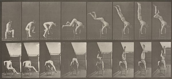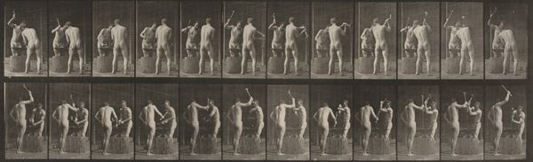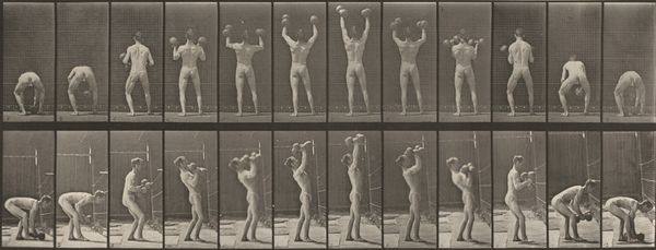 This is Plate Number 320, titled 'Lifting a 50-lb. dumbbell,' by Eadweard Muybridge. It is a photograph, printed on a sheet. Muybridge's work is fascinating because it freezes motion, turning actions into a series of discrete images. In this piece, the material reality of photography is key. Each frame captures a moment, and together, they reveal the labor and effort of lifting a heavy weight. Think about what it took to make this image. The subject's physical exertion is mirrored by Muybridge's own labor to set up the camera, time the exposures, and develop the prints. It speaks to the Victorian era’s obsession with cataloging and understanding the physical world. The image asks us to consider the relationship between human action, the mechanics of photography, and the social context of the late 19th century. It challenges us to see beyond the surface, recognizing that the medium is the message.