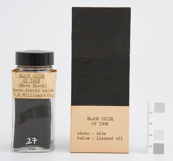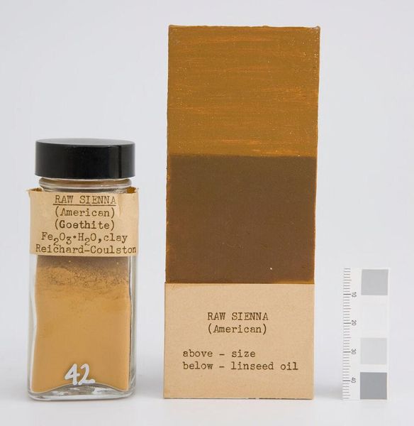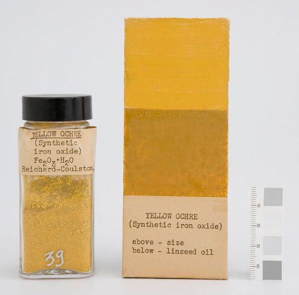 Editor: This is "Raw Umber (American)" by Reichard-Coulston Inc. It seems to be a pigment sample. I’m struck by how it makes me think about the industrial production of art supplies, and how that impacts artistic creation. What does this piece evoke for you? Curator: It makes me think about the deconstruction of art. Pigments are rarely considered works of art themselves. Raw umber's earthy tone reminds us of landscapes, but it's marketed under an American label. How does this industrial branding impact our understanding of nature and artistic expression? Editor: That’s a great point; the label really does change how I see it. Curator: It invites us to reflect on the historical and societal frameworks that surround artistic production, don't you think? Editor: Definitely, I’ll never look at a tube of paint the same way again.