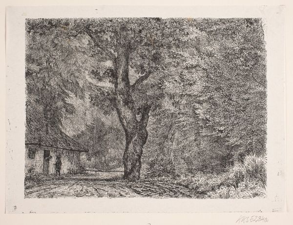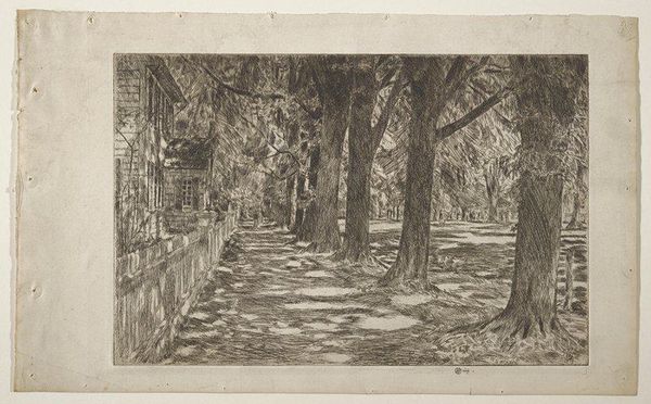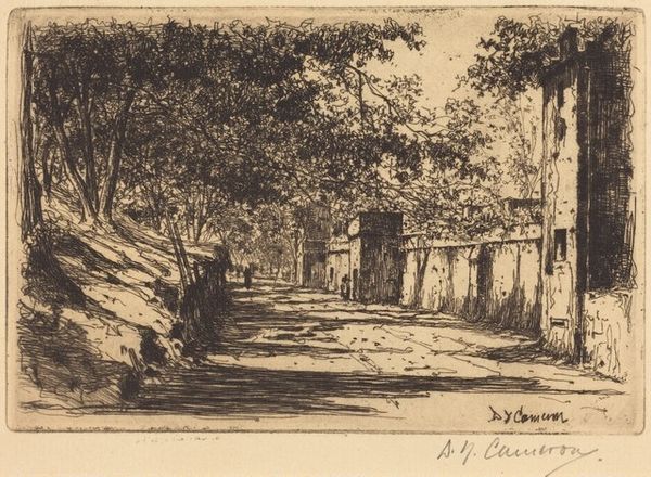 Curator: Looking at this etching by Sir Francis Seymour Haden from 1877 titled "Terras met wijnranken in Sintra," I am struck by the quiet intensity it conveys. Editor: Oh, yes, immediately I see that too; that hazy almost dreamlike quality that belies a deeply rooted sense of place. It's quite melancholic actually, as if captured through the filter of memory. Curator: Precisely! The Rijksmuseum holds this drawing as an insightful example of how Haden played with line and texture to evoke the atmosphere of Sintra, a region celebrated for its natural beauty, which itself became contested in relationship to burgeoning aristocratic tourism. Editor: I find the composition particularly interesting. The rough-hewn rocks in the foreground, those textures and those precarious structures reaching out into the landscape...they suggest both a raw, untamed landscape and a cultivated space, those "wijnranken", the wine vines. It’s all beautifully unbalanced in a compelling way. What strikes me is the lack of sentimentality here; there are certainly some gorgeous visual and scenic things to drink in, but at the same time the austerity really grabs hold. Curator: A point well taken. It hints at the tensions in 19th-century landscape art, that push-and-pull between the idealized and the real. The sketch aesthetic here is also part of a movement, it doesn’t attempt to reproduce photo-realism but instead, prioritizes a sensitivity to the landscape and a raw aesthetic interpretation that might have even felt "shocking" for many people at the time. Editor: I get the feeling that Haden saw not just what was beautiful, but also what was changing. There is a historical narrative woven in here between natural forces and man’s influence on them. It reminds me to cherish those moments where untamed beauty lingers. Curator: Yes, looking closer I too now have a sense of its powerful evocation. I hadn't originally seen it. Thank you for prompting me to engage in a deeper viewing experience. Editor: That is always what the goal is, right? To facilitate more nuanced and engaged understandings, and for all of us to appreciate all the layered experiences here with Haden in Sintra.
