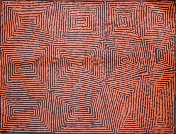 Editor: This striking work is titled *Untitled (WAT2885)* by Warlimpirrnga Tjapaltjarri, created with acrylic paint. The contrast between the geometric and organic shapes is quite arresting. How do you interpret this work, considering its blend of patterns? Curator: I see this work as a powerful assertion of Indigenous identity and resistance through the visual language of Country. The geometric patterns likely reference specific sites or ancestral narratives deeply embedded in the land. Think about the history of Indigenous art being dismissed as "primitive" and consider how Tjapaltjarri reclaims abstraction, using it to encode complex cultural knowledge that resists colonial attempts at erasure. Does this challenge the viewer to confront preconceived notions about Aboriginal art and its relationship to Western art movements? Editor: That's a fascinating perspective. I initially focused on the visual similarities to Abstract Expressionism or Pattern and Decoration. So are you saying those connections are potentially misleading, if not completely irrelevant? Curator: Not entirely irrelevant, but definitely secondary. While it is important to appreciate Indigenous artistic production as existing in conversation with global art trends, understanding this work necessitates acknowledging the long history of dispossession and the ongoing struggle for self-determination faced by Indigenous communities. Can you imagine how the artist's lived experience might shape his approach to pattern and form, imbuing it with a depth of meaning often absent in Western abstraction? Editor: Absolutely. Considering the historical and social context provides a much richer understanding. I appreciate how it moves beyond purely aesthetic appreciation. Curator: Indeed. This piece invites us to consider art as a form of cultural survival, a testament to the enduring strength and resilience of Indigenous traditions in the face of ongoing colonial legacies. Editor: I'll definitely carry that perspective forward. It highlights the importance of engaging with the stories behind the art, not just the visual elements.