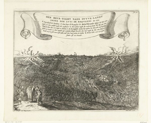Curator: This is a fascinating print titled “Nachtelijk tocht van Spaanse soldaten door het water naar Duiveland, 1575,” made anonymously between 1649 and 1651. The Rijksmuseum is fortunate to have it in their collection. What are your first impressions? Editor: It's bleak, stark almost. The contrasting dark lines of the figures and water against the white sky. The etcher expertly captures a sense of struggle. There’s such potent linearity—those regimented lines create an oppressive, almost suffocating atmosphere. Curator: Indeed. From a historical perspective, the piece is important as a record. It depicts the Spanish army's night march through water towards Duiveland in 1575. An ambitious attempt during the Eighty Years’ War to capture Zeeland, that ultimately failed because of the floodings. Editor: Notice how the artist uses the technique of cross-hatching. These are not just lines but a series of intersections that render three-dimensionality. The play of light on the water's surface creates an illusion of depth and movement. Curator: It’s an excellent demonstration of how prints were used not just as art objects, but also as tools for propaganda. Prints circulated widely, helping shape public opinion. Images such as this one cemented national identities during times of conflict. You have soldiers wading determinedly through neck-high water toward a distant shore defended by boats; it presents them in a strong manner. Editor: Though technically impressive with its intricate lines, the emotional impact of this work is also significant. Look closely. Notice the figures seem almost mechanical, devoid of individuality. And even though, as you say, these soldiers wading give an impression of power, there's something tragic, foreboding to it all as well. Curator: It shows how social and political turmoil influenced artists of that time. In some ways, it is just one fragment extracted from a broader narrative canvas that tells us not just what was seen then but also how that was to be viewed, or understood, within specific socio-political circles! Editor: I find the formal arrangement compelling—how simple etched lines can embody chaos. Thanks for contextualizing this historical account and reminding us of art's reflective power. Curator: My pleasure. Looking at it through this artistic lens adds to understanding what it represents: The image helps people better contextualize it than words do!