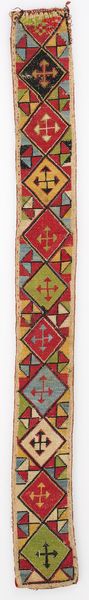 This decorative band for clothing, of unknown date, comes to us from an anonymous maker. Textiles like this one are more than just decorative, they’re deeply intertwined with the cultural and social fabric of the communities they come from. As a garment accessory, this piece wasn't just about aesthetics; it was about identity. Consider how clothing is often tied to gender, status, and cultural identity, each thread carrying stories of the maker's life, beliefs, and social standing. It invites us to consider questions of visibility, representation, and the unspoken narratives that shape our understanding of the world. What does it mean to adorn oneself in a way that speaks to tradition, while also carving out space for personal expression and identity? How does our understanding of beauty shift when we recognize the labor, history, and cultural significance woven into every piece of cloth? This band challenges us to recognize that every object has something to say.