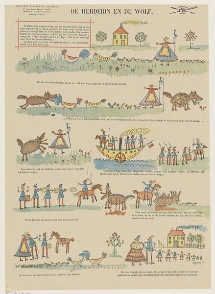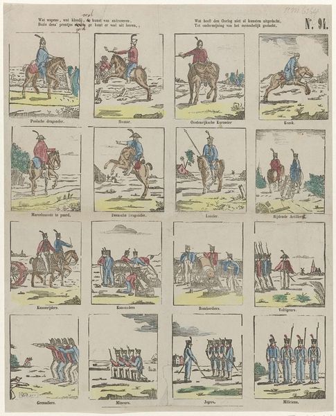 This print, made by Willem Carl Wansleven, presents a series of vignettes in a neatly organized grid. The scenes are rendered in soft, muted colors that suggest both delicacy and a sense of historical distance. The composition is structured by the arrangement of individual scenes, each a self-contained narrative snapshot. Wansleven employs line work to define figures and objects, using a delicate touch that enhances the print's overall gentle quality. The visual elements are not just decorative; they are carriers of cultural information. For instance, the depiction of a dancing bear led by performers isn't merely an aesthetic choice but reflects societal amusement. The print’s structure invites us to consider how these images reflect societal values and pastimes. We can view the artwork as a semiotic system, where each scene serves as a sign that represents a specific cultural practice or idea. This encourages an ongoing process of interpretation, allowing for continuous engagement with the artwork's historical and cultural context.