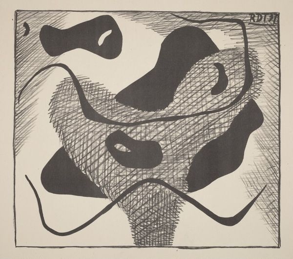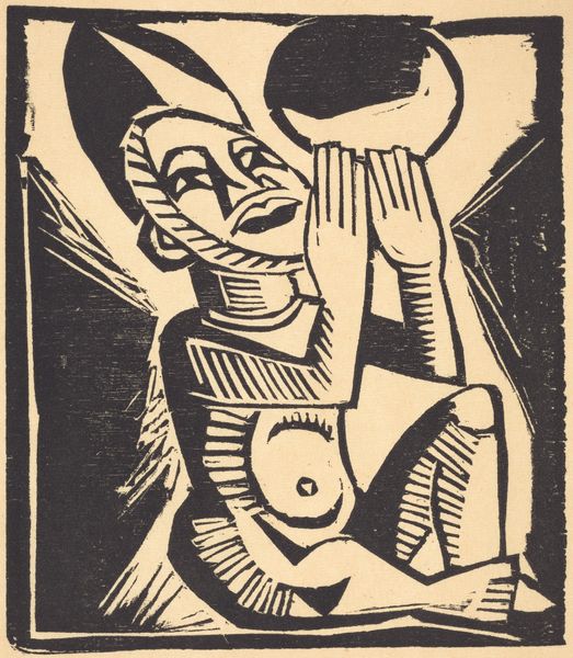 Editor: Ernst Ludwig Kirchner's "The Kiss," a woodcut from 1930. It has this stark, almost grotesque feel. What is it that strikes you most when you look at it? Curator: Well, Kirchner, an Expressionist, consistently grappled with the alienation of modern life and its effects on human relationships. Considering this context, that alleged kiss almost resembles an act of violence or devouring. Notice how the simplified forms reduce figures to near-caricatures, stripping away individual personality? Editor: It's true, the harsh lines and contrast contribute to that unsettling atmosphere. What do you think Kirchner was trying to say about intimacy during that era? Curator: I wonder, is this just about two individuals, or does it perhaps reflect a broader critique of societal connection? Kirchner, part of the "Die Brücke" group, rejected academic traditions in favor of emotionally charged art, often depicting urban anxiety and distorted realities. Is he challenging the very notion of romantic love in the face of modernity's dehumanizing forces? Is this kiss an honest depiction of how a generation kisses and interacts with each other? Editor: I didn’t think about the social commentary behind the art. The Expressionists use intimate acts to speak to bigger audiences and moments in time. Thank you. Curator: Exactly! Considering the cultural shifts during the Weimar Republic, with its heightened sexual freedom and social unrest, we see a darker, less romantic perspective of love than many portrayals of the era. Always consider art a mirror to reality, but often a distorted one. Editor: It makes you wonder what a "real" mirror would show you from then.
