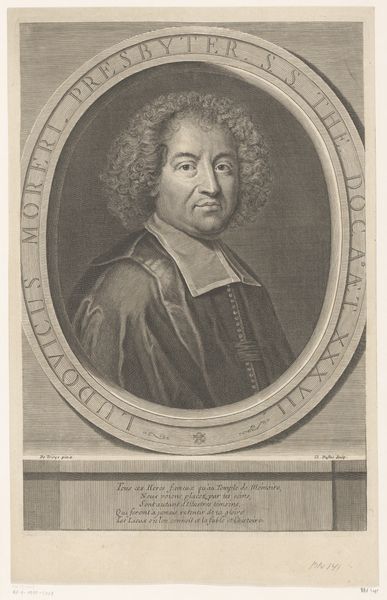 Curator: We’re looking at “Portret van Jacques Amproux de Lorme” by Pierre (I) Simon, dating back to the period between 1650 and 1679. It's currently held here at the Rijksmuseum. This engraving offers a glimpse into the Baroque portraiture of the time. Editor: My first thought? A bit melancholic, wouldn't you say? It’s like looking into a world of powdered wigs and simmering secrets. All in shades of grey, like an old photograph whispering stories I can almost grasp. Curator: Indeed. The somber tones are typical of the era, but the work does offer a meticulous representation of the subject, emphasizing status and gravitas through details like the elaborate collar and refined pose. The Baroque style emphasizes the social hierarchy and decorum of the time. Editor: That collar! It looks awfully itchy! One wonders how much comfort was sacrificed on the altar of status. And you know, his eyes... They tell of something more than just social standing, don’t they? A flicker of something real. Curator: Absolutely. But even those glimpses of ‘realness’ were carefully curated. Consider how portraits functioned during this period. They were instruments of power and legacy. We must analyse who had access to such portraits, their societal impact. Editor: Oh, curated sadness, that’s brilliant! Like a carefully arranged stage for the soul. Perhaps it's a self-awareness, trapped beneath the frills and formality, desperate to breathe? I can feel that, like a poem hidden in the folds of that very starched linen. Curator: A powerful reading. Examining class structures and representational systems allows us to examine social justice issues implicit to the era’s art. This work’s use of precise lines to suggest texture in the fabric also reveals remarkable skill and underscores the artistic standards and class biases of the time. Editor: So here we stand, centuries later, still peering into his world, wondering about his story and the burdens of his beautiful collar. What a dance through time, and across social barriers, etched in ink and laced with melancholic secrets. Curator: Exactly. It's a stark reminder of the constraints and expectations placed on individuals within a structured society, making it a resonant subject for contemporary dialogue.