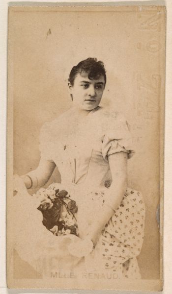 Editor: Here we have "Mlle. Renaud" from the Actors and Actresses series by Allen & Ginter, dating from the late 1880s, residing at The Met. It's an albumen print, which gives it this warm, almost sepia tone. The figure seems very reserved. How do you interpret this work? Curator: This image, like others in the series, taps into the 19th-century fascination with celebrity, particularly stage actresses. They were symbols, larger-than-life figures embodying various ideals. Mlle. Renaud, poised and demure, presents a carefully constructed image of femininity. Editor: Constructed in what way, precisely? Curator: Note the flowers she holds, and the delicate fabric of her dress. Flowers often represent virtue and beauty, linking her to idealized concepts of womanhood. Her gaze avoids direct engagement; her beauty is passively displayed. Think of the emotional weight those choices convey to a Victorian audience consuming her image alongside their cigarettes. Editor: So the cigarette card itself becomes a vessel for conveying cultural values. Curator: Precisely. This card isn't just a portrait; it's a piece of social currency. What we might find in baseball cards now, they found here. What image are the distributors selling along with this image? Does the cigarette enhance or diminish the presentation of her social persona? Editor: That's such a fascinating point—how an actress, a flower bouquet and the 'right' tobacco can all combine to signify more than each does separately! I'll definitely look at these cards with fresh eyes now. Curator: Exactly. Every element tells a story.
