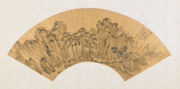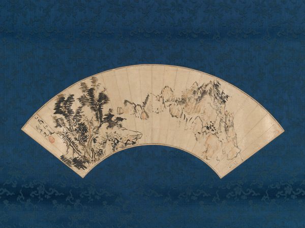 Curator: Here we have “The Gathering at the Orchid Pavilion,” a painting attributed to Tang Yin from the Ming Dynasty, dating back to the 15th or 16th century. It employs ink on paper. Editor: Immediately, the scene's tranquility strikes me. There’s a distinct harmony between the calligraphic text and the misty landscape. The composition, with its subtle tonal gradations, evokes a real sense of peaceful contemplation. Curator: I'm drawn to the material conditions of its production. Paper would have been chosen carefully. Its absorbency dictates the flow of ink, influencing every stroke. And consider the social context: landscape paintings were often commissioned by the elite, reflections of power and refinement intended for select audiences and display. Editor: Indeed. The formal arrangement also echoes that. Observe the placement of the elements: the pavilion nestled within the rocks, the mountains framing the composition. And the texture that suggests both atmospheric depth and material presence is also achieved via masterful gradations of ink wash, is very powerful in such limited contrast. It has a symbolic resonance, no? A curated vision of harmonious living, and a return to simplicity. Curator: I'd argue this simplicity isn't innate, but rather crafted. Think of the labor behind sourcing the pigments for the ink, the apprenticeship involved in mastering brushstrokes. It is labor that informs aesthetic choices. Even its functionality, it is actually made for an everyday object – a handheld fan that has been transformed by an artistic rendition. Editor: I don't dispute the artistry involved in its creation; you point out valid points. Still, looking at it with its elegant design with dynamic, sweeping lines; subtle details – all carefully balanced within this arc – suggest an inner stillness, perhaps even enlightenment. A visual meditation on nature, culture, and artistry is undeniable, regardless of the materials. Curator: Seeing how the mundane materials are imbued with the aspirations of the artisan gives meaning to a work beyond formal achievements. We can even think about how these works were meant to circulate as commodities within specific networks. Editor: I concede to the important social aspects it holds as well, but these elements cannot be ignored within that understanding. This is a masterclass in evoking the spirit of harmony. Curator: A powerful fusion, then, of form, meaning, and tangible history. Editor: Yes, the piece resonates differently after delving into it deeper together.
