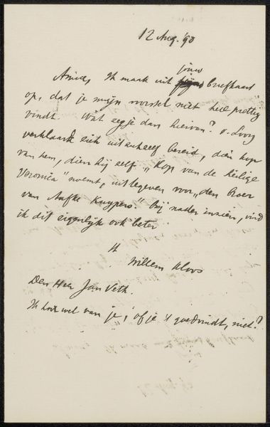 This is a letter by Willem Kloos to Jan Veth, penned in Amsterdam on September 28, 1891. Immediately, the eye is drawn to the contrasting dark ink against the pale paper, creating a visual rhythm across the rectangular field. The controlled, yet fluid strokes of Kloos' handwriting form a constellation of shapes that fill the space. The composition reveals a deliberate arrangement. The date and location are neatly placed at the top, while the body of the letter flows downwards, concluding with the signatures. This structure, combined with the letter's contents—a mix of congratulations and literary critique—mirrors the formalist concerns of the era. It explores the intersection of aesthetics and communication. The letter challenges conventional notions of art. It destabilizes the separation between art and life. The act of writing, the materiality of ink and paper, and the carefully structured sentences become elements of a broader artistic discourse.