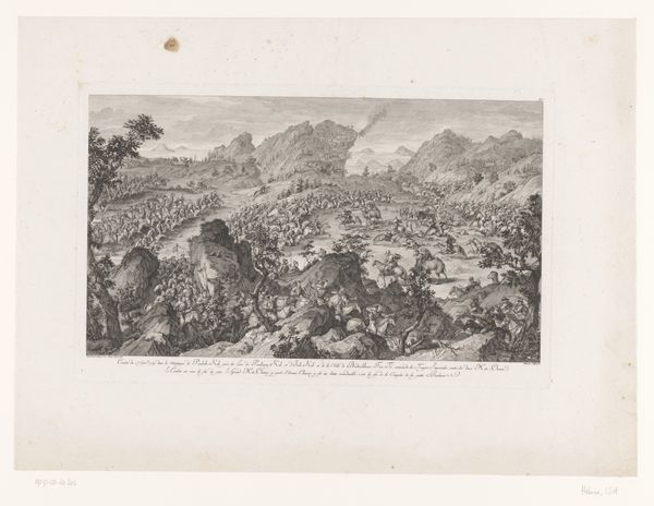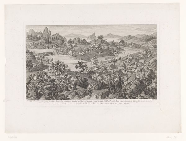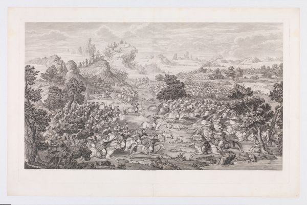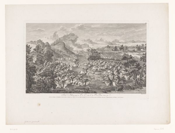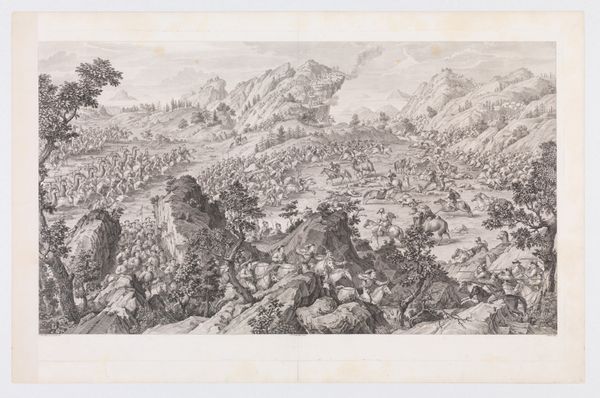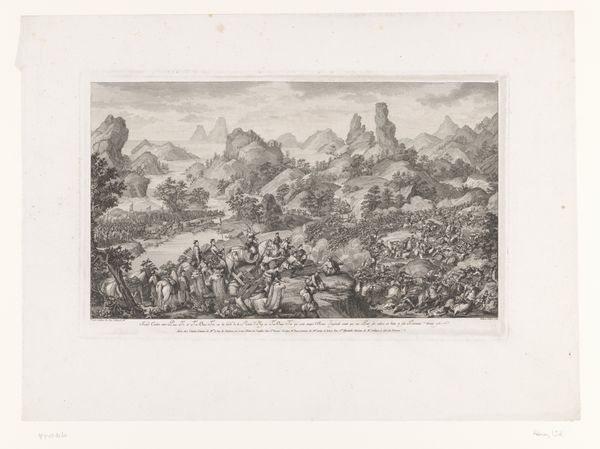 Augustin de Saint-Aubin created "The Great Victory of Qurnam" as an engraving, a medium that allowed for wide distribution of imagery across 18th-century Europe. This print depicts a battle, but what does it tell us about the social and political context in which it was made? The image presents a clash between two forces amidst a mountainous landscape. On one side, we see neatly arranged European soldiers, their regimented lines contrasting sharply with the more loosely organized figures on the opposing side. This visual distinction speaks to the era's fascination with military order and colonial power. France, where Saint-Aubin lived, was deeply engaged in colonial expansion at this time. Such prints served to legitimize and celebrate these ventures, shaping public opinion and reinforcing a sense of national pride. To understand this artwork, one might delve into military history archives or study the visual culture of 18th-century France. Art, you see, is never created in a vacuum; it reflects and shapes the world around it.