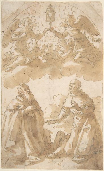 Editor: This is "The Vision of Saint Anthony of Padua," a Baroque-style intaglio print and etching, dating from between 1645 and 1705, by Vicente Salvador Gómez. The linework feels incredibly delicate, almost ethereal. What do you see in this piece, particularly in how the materials and process contribute to its meaning? Curator: The etching technique here, and the printmaking process in general, are central. This wasn't a unique object crafted by the singular hand of the artist, but a reproducible image made accessible to a wider audience. Consider how the very act of printing allows for the dissemination of this vision, blurring the lines between high art and popular devotion. Notice, too, how the etched lines, almost nervously rendered, evoke a sense of immediacy – as if capturing a fleeting, intensely personal experience. Editor: So, it's less about the artist's individual skill and more about the act of making it available through mass production? Is that fair? Curator: Precisely! The material realities of printmaking—the labor involved, the costs of production, the network of distribution—all influence the artwork’s reception. What was the role of these devotional images during this period? How might their consumption shape beliefs and behaviors? This is not simply an image; it's a manufactured object with a purpose. Look at how the scene itself is rendered; how do you think that rapid style might relate to printmaking of the era? Editor: I suppose it's inherently reproducible, so a more refined approach wouldn't really amplify the message and might not suit the process... I’m starting to think differently about the piece now. It’s less about a divine moment and more about how such moments were fabricated and distributed. Curator: Exactly. We've considered the networks through which art is produced and circulates, the artist being just one factor. Remember, every artwork has its means of production and consumption. Editor: Thanks for helping me to think about art beyond just the aesthetic, into how it’s made and received!