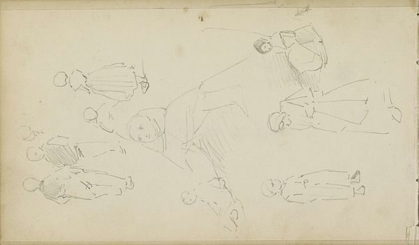 Curator: This is a page from George Hendrik Breitner's sketchbook, titled "Figuurstudies," dating from around 1880 to 1882. It's a pencil drawing, currently held in the Rijksmuseum. What strikes you first about it? Editor: A certain fragility, I think. It's fleeting, as though these figures are just emerging from a dream, or perhaps being erased. Curator: Exactly. Consider that this work gives insight into Breitner’s process. He would use these rapid sketches, almost like notations, to understand movement and form. We see the pencil strokes, the layering, the corrections. It's all about the physical act of capturing something ephemeral. Think of the cost of materials at the time and access. Sketchbooks were treasured. Editor: And those forms he's capturing carry the weight of history. Note the clothing— suggestions of military bearing or formal wear. These are figures conscious of their social roles. They present a carefully constructed image of themselves. It makes you wonder about the stories they hold within. The sketchy nature speaks of how he captures people fast moving through the modernizing streets. Curator: Yes, but it's also about the craft of seeing. Breitner, with his emphasis on materiality and documentation through photography and drawings, documents a reality, a moment in time and the changes to Amsterdam. It brings a certain kind of knowledge to making visible that modernity and industrialization changed social behaviours. Editor: Yet, they’re incomplete, these images are potent. The quick, unfinished lines feel like a memory surfacing. Those sparse pencil lines act as symbols, markers that recall a cultural consciousness from this Dutch milieu in the late 19th century, hinting at a much bigger narrative. I wonder what the symbolism might be to our audience of what a soldier represents? Curator: Fascinating to see how these “initial sketches” speak in various ways to each of our points of view and fields of expertise. It also shows how important process is and not to only look at finished art. Editor: Indeed. It enriches our understanding, doesn't it, allowing the resonance of an art, time, and its imagery and symbolism, to echo long after the initial viewing.