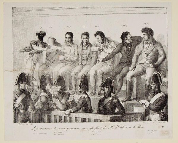 Curator: Sébastien Coeuré, born in 1778, created this print entitled "Miss Manzon is Threatened." The scene is intense. Editor: The stark contrasts immediately create a mood of terror and urgency. Look at the way figures cluster around a central conflict, obscuring a full view. Curator: The figures in the scene, their clothing, and poses, all speak to a disruption of social order. The woman in traditional garb, the raised dagger... It's a tableau of fear and displacement. Editor: The artist's etching technique captures the details of fabric and facial expressions, and the sense of immediacy is palpable. We can almost feel the cold steel of the dagger and the raw panic of the moment. Curator: Indeed, the print serves as a stark reminder of the violence and instability of that era, capturing the psychological weight of the time. Editor: It is an example of how art can serve as both a mirror and a record, reflecting and capturing the anxieties of the people.