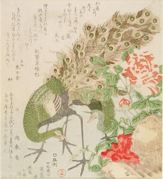 Curator: This is a page from the illustrated book "Kachō Gaden" by Katsushika Taito II, housed here at the Harvard Art Museums. Editor: It feels like a quiet moment caught in time, almost voyeuristic—the bird so focused on those flowers. Curator: Woodblock prints like these, often overlooked, are incredibly insightful when we consider the history of artistic representation and the colonial gaze. These images served to exoticize and romanticize Japan for Western audiences. Editor: That's heavy, but the lines are so delicate, almost like a whisper. It makes me want to sketch something similar, to capture that fleeting beauty. Curator: Exactly, and by understanding this context, we can begin to deconstruct the power dynamics inherent in these seemingly simple images. Editor: Hmm, I guess it makes me think about how we all filter and frame our experiences. Curator: Precisely, now let's move on.
