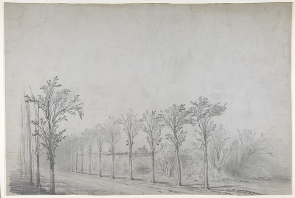 Editor: Here we have Abraham Teerlink's "Landschap met weg bij Marino," created sometime between 1786 and 1857. It’s a delicate pencil drawing, and there’s something so peaceful and almost melancholic about this simple landscape. What do you see in this piece, beyond just a road and a tree? Curator: What I see is the intersection of the public sphere and private contemplation in landscape art. Teerlink’s choice of such a seemingly ordinary scene—a road, a fence, some trees—reflects a growing 19th-century interest in the everyday lives of the public. Editor: Interesting. So, the location matters? Curator: Precisely. Marino, near Rome, would have been part of the Grand Tour circuit. But unlike grandiose paintings of ruins, this drawing highlights the accessible, unremarkable aspects. This aligns with a Romantic sentiment of finding beauty in simplicity. How might this accessibility shape a wider public's perception and relationship to landscape and place? Editor: So, it's almost democratizing the landscape, making it less about aristocratic ownership and more about shared experience. But does the drawing’s medium -- pencil -- play into that? Curator: Absolutely! Pencil sketches, compared to oil paintings, were far more accessible. This contributes to how art was consumed and understood by broader segments of society. It could be reproduced. Also, the softness and muted tones perhaps reinforce a sense of intimate connection to nature. What might this imply about the intended audience, their tastes, or their access to different types of art? Editor: I never considered that! It makes you think about who got to see and experience this art. Curator: Exactly. The history isn’t just *in* the art, but around it. How the societal framework shapes it. Editor: Right, the artwork existing not in isolation, but as an exchange! Thank you, I will need to chew over that. Curator: My pleasure! Art isn't just something to look at, but a window into past perspectives and powers, a catalyst for future ones too.