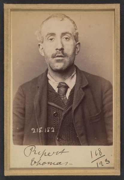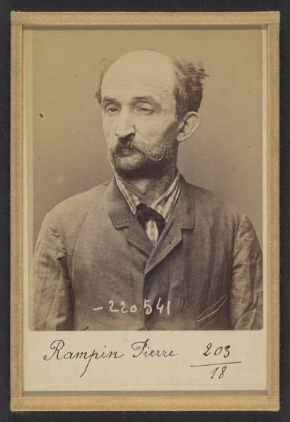 This albumen print, created by Alphonse Bertillon in 1894, presents a portrait with a purpose, or rather, a new method. The sepia tones and standardized framing are immediately striking. Bertillon was interested in creating a modern system of criminal identification. Note how the subject, Pernin, is centered, his gaze direct and his expression neutral. These are not accidents; Bertillon carefully controlled these elements to create a 'speaking likeness'. This approach challenges earlier forms of portraiture, where individuality and character were emphasized through pose, setting, and lighting. Here, individuality is suppressed in favor of objective measurement. The text at the bottom, neatly inscribed, reinforces this pursuit of standardization. The photograph, therefore, operates on two levels. Firstly, it is an image of an individual. Secondly, it functions as a data point within a larger system of classification. Bertillon’s project reflects broader concerns about social order, control, and the role of science in shaping modern life. The act of looking at this photograph invites us to consider how we categorize and understand identity.