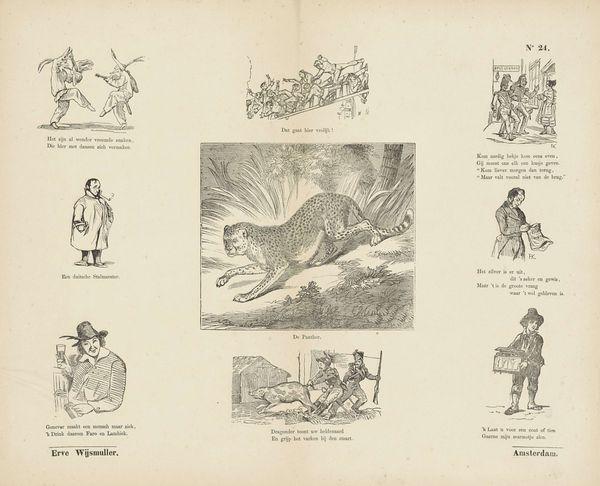 Editor: This is "De geschiedenis van Pieter, die de school verzuimd had" or "The Story of Peter, Who Missed School", a lithograph print by Franz Graf von Pocci, dating roughly from 1843 to 1920. It’s got this almost comic strip feel to it, kind of a lighthearted narrative. What strikes me most is the very clear way each frame leads into the next; what do you see in this piece? Curator: Initially, I’m drawn to the contrasting structural elements at play. Notice the sharp geometric division of the page into distinct panels versus the organic, flowing lines within each vignette. How does this juxtaposition guide our reading of the narrative? Editor: I guess it creates a visual rhythm. You see the stark contrast frame by frame between what he should be doing, like being in school, with what he actually is doing like, fishing. Curator: Precisely. Note how Pocci uses linear perspective, especially in the classroom scene and the fishing scenes, to create depth and draw the eye. Does this contribute to a sense of realism or perhaps something else? Consider, too, how the lithographic process itself – the stark black lines on a white ground – emphasizes clarity and form, even within scenes implying dynamic motion. Editor: So, you’re saying it’s less about what's happening in the story, and more about how the artist is using these techniques to lead us through it? Curator: Indeed. And that these visual cues function as much to entertain as to instruct. Look at the framing in each panel—it is consistent, like stanzas in a poem, but with unique variations. Consider that form and function work together. What did you learn by considering those together? Editor: It changes how I view sequential art. The structure reinforces the story in subtle, clever ways, beyond just the content. Thanks! Curator: A pleasure. Focusing on visual and material elements opens exciting possibilities for appreciating and thinking about narrative images.