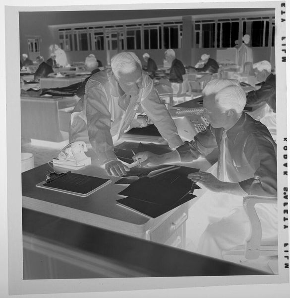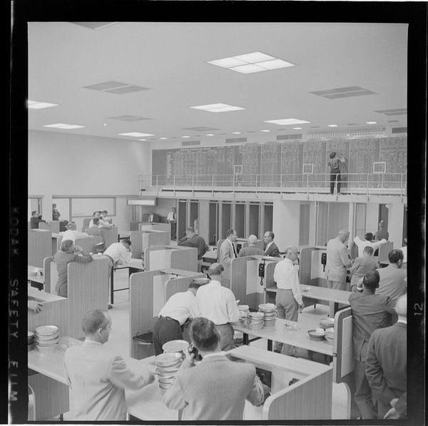 Curator: This photograph by Jack Gould, titled "Untitled (businesspeople in Mercantile Exchange auditorium)," captures a moment within a trading floor. The image itself, a gelatin silver print, is quite small, only about 5.7 centimeters square. Editor: It has a certain coldness to it, doesn't it? The grayscale tones and boxy forms suggest a kind of detached observation. It feels very regimented. Curator: Indeed. Gould’s composition highlights the structured chaos of the trading floor. Note the raised platform at the back; a space, perhaps, for observing or directing the traders below? It reflects systems of power. Editor: And the repetition of desks and figures amplifies that sense of order and control, even if the activity itself is likely frantic. The tight crop adds to the claustrophobia. Curator: The photograph, though small, presents a broader commentary on the nature of economic activity. Gould offers us a stark, almost sterile view. Editor: It's a powerful image that uses formal constraints to convey the feeling of constraint within the depicted world. One can almost feel the tension.