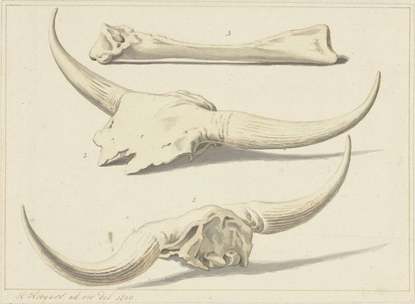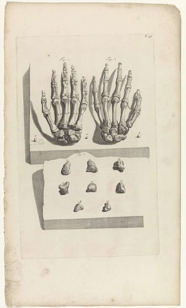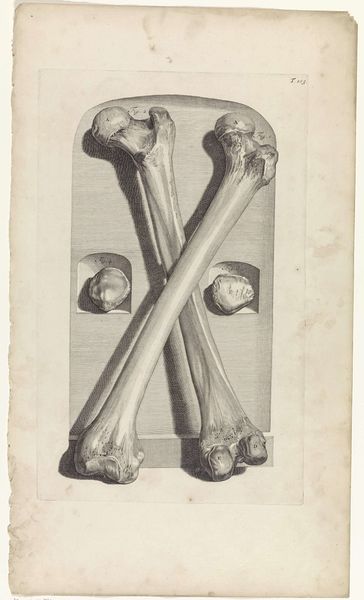 Pieter van Gunst created this anatomical study of arm bones during the late 17th and early 18th centuries, a period marked by significant advancements in scientific understanding and anatomical study. The image reflects a growing societal interest in the human body, driven by the scientific revolution and the Enlightenment. During this time the study of anatomy was essential for medical practitioners, but also embodied social and philosophical dimensions related to identity, health, and the human condition. While this work appears to simply document the bones of the arm, the artist's attention to detail prompts a dialogue between science and the human experience. This piece highlights a period where scientific inquiry started influencing social norms, shaping views on health, gender, and race. How does this detailed study of the arm bones influence your understanding of your own body and its place in society?