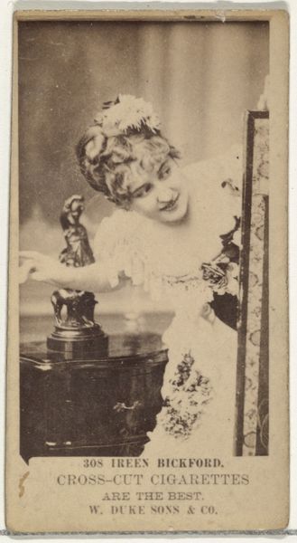 Editor: So, this is a portrait of Ellaline Terriss, an actress, part of a series made between 1885 and 1891 by Allen & Ginter for Virginia Brights Cigarettes. It's a gelatin silver print, and it feels very much of its time, capturing a posed elegance. What stands out to you about this piece? Curator: For me, its power lies in its connection to consumption and labor. It's not just a portrait; it’s an advertisement, a product itself, literally included in cigarette packs. Consider the materiality – a photograph, reproduced en masse, meant to be briefly enjoyed then discarded with the packaging. How does that transient existence affect our understanding of it as "art"? Editor: That's interesting. I hadn't really thought about its original purpose so much. So, you are saying that we can learn more about society by looking into the industrial purpose and method of making of the artwork? Curator: Precisely. The image isn't isolated; it’s enmeshed in a network of production, distribution, and ultimately, waste. Who was Ellaline Terriss to the consumers of these cigarettes? What did she represent? Her image was another consumable along with tobacco. It blurs the lines between art, commodity, and the constructed image of celebrity. How does understanding the means of its production alter your perception? Editor: It makes me think about how fleeting fame can be, and the amount of labor needed to mass-produce images like this one. Knowing it was made for cigarettes changes everything, it feels…less precious, and more accessible. Curator: Exactly. By considering these photographs in the context of industrial capitalism and mass media we can expand the discourse about art’s relationship to broader social and economic structures. Editor: This makes me appreciate the portrait more, recognizing the industrial aspect and all the things it touches from that era! Thank you! Curator: My pleasure! Considering art as deeply rooted in the conditions of its making and consumption allows us to see it not as an isolated creation, but as an integral component of our historical reality.