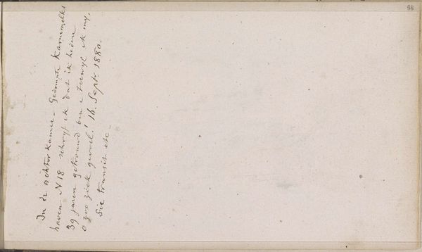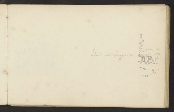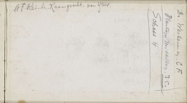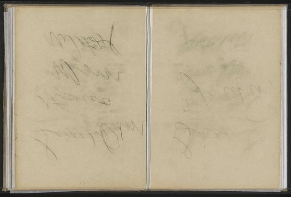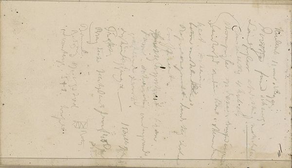 Editor: So, this is "Kleurnotities," or "Color Notes," by Johannes Tavenraat, done around 1840 using pencil on paper. It's a landscape piece. Honestly, it feels almost…unfinished? Just a few scribbled notations. What do you see in this piece that I'm maybe missing? Curator: Ah, unfinished, yes! But I find that charming, don't you? It’s like catching the artist in the act of thought. Imagine Tavenraat standing there, perhaps the wind is picking up, hastily capturing impressions. It’s a snapshot of fleeting moments, an essence distilled onto paper. It's Romanticism boiled down to its most honest core. Almost a haiku in pencil strokes. Editor: A haiku, I like that. So it's less about the perfect rendering and more about the *feeling* of a landscape? Curator: Precisely. Think of it as Tavenraat’s personal color map – a whisper of how he perceived light and shadow. What colors do *you* imagine filling those notes? That space… That paper... It offers boundless opportunity for imagination. Do you feel more water or sky here, to *your* eye? Editor: Definitely sky. It’s a useful reminder that even something simple can hold so much intention. Curator: Indeed! Sometimes, the smallest glimpses offer the biggest windows into an artist’s process and inner world. And I suppose… it might even allow us insight into *our* own interpretations, as well. A successful journey for art.