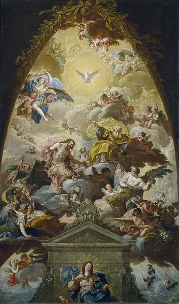 Curator: "The Vision of St Francis Xavier", oil on canvas, appears to be the work of Giovanni Battista Gaulli. The painting presents a figure in dark robes, surrounded by a swirling cloud of cherubic figures. Editor: There's a beautiful contrast at play. The saint, anchored to the earthly plane, rests upon what appears to be animal fur, rendered with remarkable texture. This creates a grounded foundation against the ethereal cloudscape bursting with figures overhead. Curator: Absolutely. Gaulli employs visible brushstrokes, particularly in the celestial forms, creating a sense of dynamic movement and painterly craftsmanship. Consider how this relates to the economics of Baroque artistic production and devotional painting: rapid execution of a vast ceiling for maximum impact. Editor: That tension you describe reflects the ideological struggles inherent to representations of sainthood during this period. Note how the upward gaze draws attention away from the very human body and situates it instead within the realm of spiritual ecstasy, echoing colonial power structures through visual hierarchies. Curator: Fascinating. The saint clutches a crucifix. Look closely and observe the materials and techniques, we see how these objects speak volumes about status, belief, and patronage. Who produced the pigments? Where were they sourced from, and what does this mean for us today? Editor: The abundance of cherubs in the upper portion certainly echoes the colonial project's justification as divinely ordained, where angels can be seen as symbolic bearers of a one-sided evangelism that completely disregards indigenous beliefs. It encourages further exploration of religious doctrine during times of conflict and its continuing impacts today. Curator: Indeed. There is much here to examine about how labor and resources shaped its construction and continues to influence its interpretation today. Editor: "The Vision of St Francis Xavier" then, becomes not just an object of beauty but an opportunity for critical reflection of colonial narratives and persistent power imbalances embedded within faith and history.
