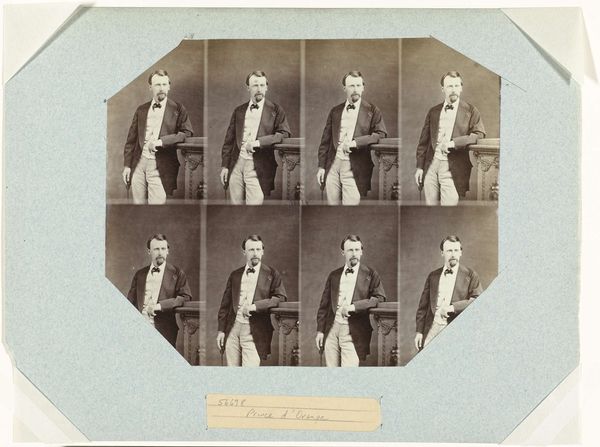 Editor: This daguerreotype, "Seven Portraits of Crown Prince Willem," by André-Adolphe-Eugène Disdéri, made between 1859 and 1860, strikes me as a sort of proto-photobooth. The prince appears in several different poses on a single plate, some dignified and others...well, reading a newspaper. What do you make of this unusual format, its function as a document? Curator: It’s interesting, isn't it? I see a charming glimpse into royal life, though staged, of course. We have Prince Willem in formal stances alongside what might be attempts at capturing more informal moments. It reflects the changing nature of photography at that time; It went from stiff, formal portraiture towards something more…narrative. One must remember Disdéri’s innovative role in popularizing carte de visite photography – these were easily reproducible and collected. Editor: So, these weren’t intended to be singular artworks, but rather multiplied and distributed? Was the Prince perhaps ahead of his time with a royal selfie strategy? Curator: Precisely! Think of it as an early form of public relations, disseminating images of the royal figure to a wider audience. Each little picture serves as a controlled snippet of his image. It offers different facets while retaining the air of majesty that befits the Crown Prince. It gives one the opportunity to study him. Doesn’t that change how we look at it now? Editor: Absolutely. It transforms from a collection of portraits to a calculated act of image-making. Thank you. Curator: Indeed, it opens new perspectives, doesn't it? Now when I see something that repeats and is designed to reflect different poses, it will take me to an archive photo and think about the meaning that image gives. Thank you.