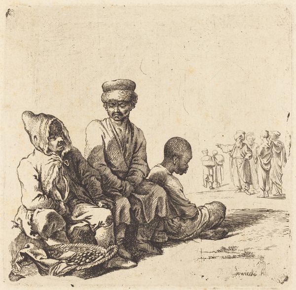 Philips Koninck created this drawing of Joachim with the infant Christ, Anne and another figure in the 17th century. It is rendered in pen and brown ink, with touches of watercolor on paper. The fluid strokes and washes imbue the scene with a sense of immediacy, as though capturing a fleeting moment. This directness is reflective of the artist's skilled hand, deftly manipulating the pen to create variations in line weight and tonal depth. Koninck has used watercolor to add subtle color accents, enhancing the expressiveness of the figures and the atmosphere of the composition. The drawing reflects a shift toward more informal and intimate depictions of religious subjects, characteristic of Dutch art of the period. This movement moved away from grand, idealized scenes towards more relatable human experiences. By focusing on the intimate interaction between the figures, Koninck invites viewers to contemplate the humanity inherent within the biblical narrative. It’s a wonderful instance of the democratization of artistic practices in the Dutch Golden Age.