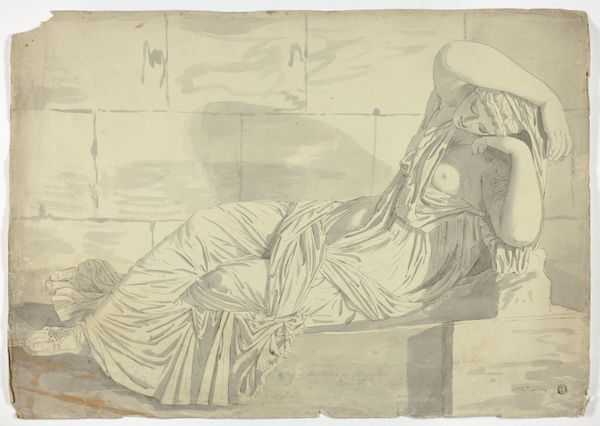 Paul Delaroche created this drawing, Drapery Study for the Figure of the Dying Mary Magdalen, in the 19th century, using graphite on paper. The drawing presents a figure draped in cloth, reclining, with a pale tonality that evokes a sense of stillness. The structure of the composition is based on a clear organization of form. The figure’s posture creates a diagonal line, balanced by the soft curves of the drapery. Delaroche meticulously renders the folds and shadows, which shows his academic training. The textures achieved through the graphite accentuate the weight and fall of the fabric, and the artist's attention to detail transforms the cloth into a central element. Consider how the formal qualities—the careful arrangement, the play of light and shadow, and the delicate lines— invite an emotional response. These elements create an artwork of both technical skill and subtle expression. The drawing functions as an intersection of representation and artistic interpretation.