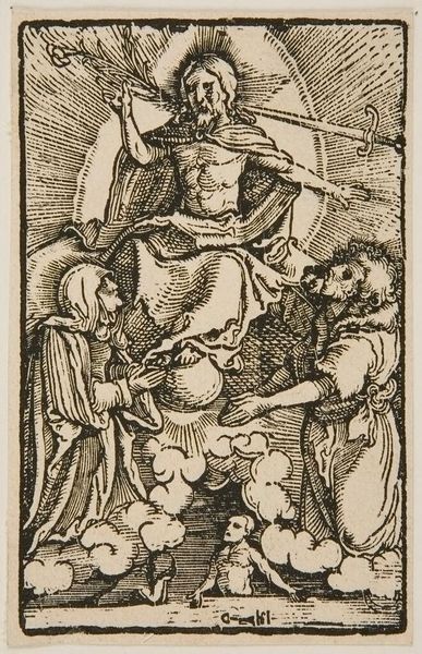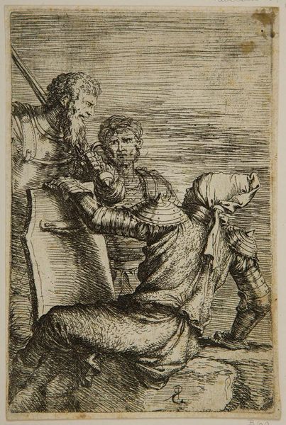 Editor: This engraving, "A Couple of Peasants with an Egg-Basket" by Jakob Binck, shows three figures in what looks like a transaction. What do you see in this piece? Curator: It's tempting to see this as a simple genre scene, but I wonder how it reflects the social hierarchies of the time. The way the figures are presented, what might it say about how the artist, or society, viewed the peasant class? Editor: So, it's not just a snapshot, but a commentary? Curator: Precisely. Consider the power dynamics inherent in economic exchange. Is Binck critiquing or reinforcing those structures through this portrayal? What's being exchanged, and who benefits? Editor: That gives me a lot to think about regarding representation and class. Thanks!