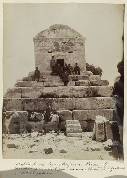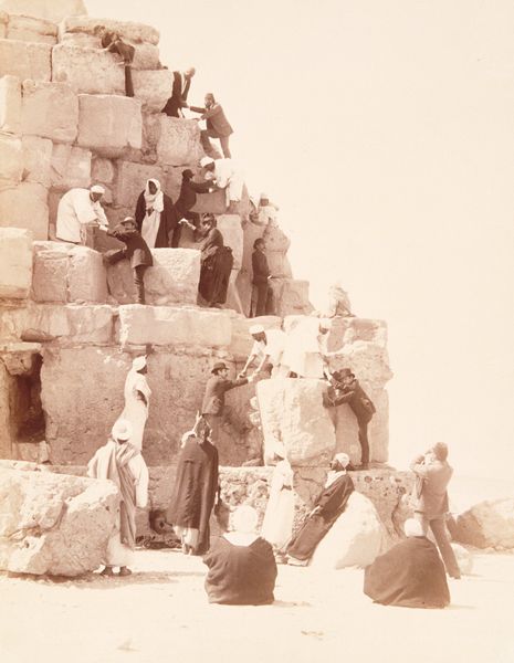 Henri Béchard captured this albumen print, "Beklimming van de Piramide van Cheops," likely in the late 19th century when Egypt was becoming a popular destination for European travelers. The photograph depicts a group of people ascending the Great Pyramid of Giza, a striking symbol of ancient power and mystery. Notice how the climbers, a mix of locals and tourists, are dwarfed by the massive scale of the monument. This juxtaposition underscores the colonial gaze through which many Europeans experienced Egypt at the time. The act of climbing the pyramid can be seen as a physical assertion of dominance, a symbolic conquest of a foreign land and its history. The pyramid itself represents more than just an ancient structure. It embodies centuries of cultural heritage and human endeavor. Yet, here it is being scaled, touched, and perhaps even defaced, reflecting a complex interplay of respect, curiosity, and colonial entitlement. This image serves as a stark reminder of the power dynamics inherent in tourism and cultural exchange.