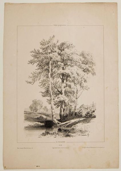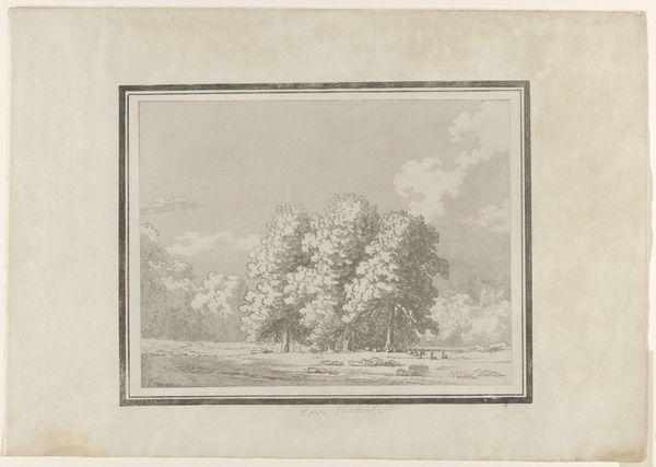 Curator: John Robert Cozens created this work, titled "Horse Chestnut." It’s a drawing, using ink and wash on paper. Editor: It feels so serene, like a quiet moment captured in a dream. The texture of the trees, the soft sky—it's incredibly calming. Curator: Note how Cozens has arranged the composition; the trees act as a central visual anchor. The horizon line provides a stable structure. Editor: The limited palette really emphasizes the shape and form. You can almost feel the breeze rustling through the leaves. Curator: Yes, the formal economy allows for a concentration on light and shadow, creating depth within a seemingly simple scene. Editor: It reminds me of lazy summer days, just lying under a tree, watching the clouds drift by. Perhaps it's simplicity is the true complexity. Curator: A lovely, intuitive observation. Cozens evokes something quite profound through such deliberate simplicity.