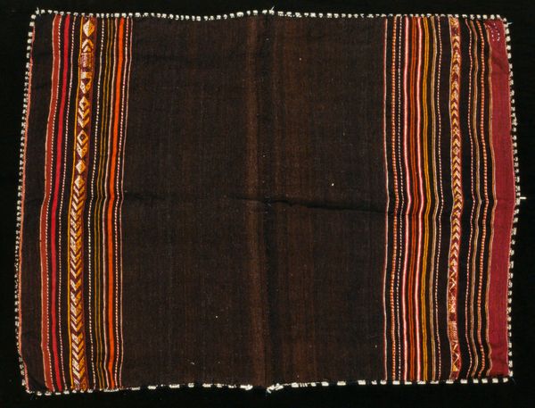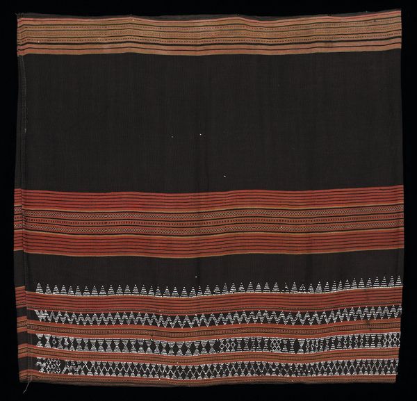 Curator: Here we have an Aymara woman's awayo, a mantle, created around the 19th century. It's now held in the collection of the Minneapolis Institute of Art. Editor: It has such an interesting arrangement. The composition strikes me first—broad expanses of dark indigo flanked by these fields of incredibly intricate, almost vibrating stripes. There's a certain weight and rhythm in how the colors and textures interact. Curator: Indeed. These awayos were not merely decorative; they were deeply embedded in the social fabric of Aymara communities. As a textile, it represents more than just personal adornment, signifying cultural identity, womanhood, and status within the community. The weaving techniques and patterns would be passed down through generations of women. Editor: Looking closer at the stripes, I see such incredible precision. The weaver's control over line and form is really on display here. And the limited palette makes the geometric designs all the more powerful. Curator: The geometric motifs you're noticing would often encode ancestral stories and symbolic representations of their cosmology and environment. The patterns were not chosen arbitrarily but reflected an individual's or family’s history and beliefs. To wear such an awayo was to wear your identity, heritage, and place in the cosmos. Editor: I am captivated by the way the linear patterns create a sense of depth and movement, pushing and pulling at the eye. How does the structural arrangement—the strict verticals and horizontals—reflect larger concepts of order or balance within Aymara society? Curator: It brings up such a critical discussion around representation and power. What happens when objects imbued with so much cultural meaning are displayed in museum spaces divorced from their original context? What responsibilities do we, as curators and viewers, have in interpreting and honoring these objects respectfully? Editor: Thank you, those points gives me much to reflect upon as I continue studying the piece. It's an amazing piece for sure. Curator: Absolutely. Understanding that history, we are now hopefully equipped to look beyond its surface aesthetic to appreciate its intricate and resonant significance.