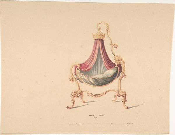 Curator: At first glance, this looks like an illustration of something Marie Antoinette might have lounging around on! A bit Rococo in its spirit? Editor: Indeed. We're looking at Robert William Hume's "Design for Spanish Chair," which dates to sometime between 1835 and 1900. The work is rendered in ink, etching, and drawing. It's currently held here at the Metropolitan Museum of Art. What feelings or symbols jump out for you in this piece? Curator: Definitely the decadence, I’m taken by the rather improbable shape. It's so delicate, balanced precariously on what looks like slender, almost ornamental legs. You can feel a real shift away from classical, more weighty forms of furniture design. What associations does the piece evoke for you? Editor: For me, it's the light touch of color. That delicate pink, especially against the detailed, almost skeletal etching of the frame, feels whimsical but maybe even a bit ghostly. It's decorative-art and suggests it has the power to be brought into being; it might even be a salesman sample! There’s almost something ephemeral about it. As if this is just a fleeting vision of opulence. Is it solid and enduring? Or delicate, passing, decorative and unrealized? It might exist now, in real life! Curator: The chair's form itself hints at Spain's influence through France at the time. There's a distinct lightness, as if the artist wants to transport the occupant, literally and figuratively, to somewhere more dreamlike. The curves almost look as though they were drawn without any practical considerations for the poor individual expected to recline on it! A fascinating expression of wealth as display, or art as something impractical! Editor: Absolutely. I'm left considering the complex relationship between design and utility. Is this object meant to serve, or merely to be seen? It leaves me wondering who dreamed up this fanciful object. Thank you, this was interesting. Curator: Agreed, a lovely reflection on decorative ambition.