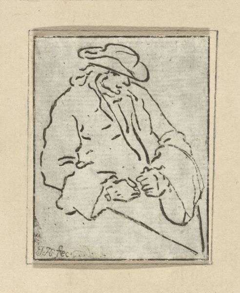 Salvator Rosa created this drawing of a seated man with brown ink on paper. The figure is set against a neutral backdrop, and framed by a decorative gold border. The simplicity of the line work here is striking. Rosa uses a minimal number of lines to describe the man's form, clothing, and posture. Notice how the lines flow fluidly, creating a sense of movement and spontaneity. The use of line is not just descriptive; it is also expressive, conveying the essence of the man's character and mood. Rosa’s sketch is not merely a representation of a man, but also an exploration of form, line, and the very act of drawing. The open space surrounding the figure emphasizes its presence, inviting us to contemplate the relationship between the figure and its environment. Ultimately, this drawing functions as a study in perception, reminding us that art is not just about what we see, but how we see it.