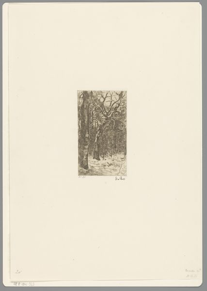 Editor: So, here we have Walter Leistikow's "Boomgroep," an etching from 1896. It feels quite…oppressive, almost? All these tightly packed trees looming over what looks like a narrow path. I'm curious, what do you see in this piece beyond the rather stark scene? Curator: Oppressive... yes, that's a powerful reaction! I feel that intensity, too. But, if you don't mind me musing for a moment, the starkness sings to me. I get lost imagining a walk there – not a jolly walk, perhaps, but one fraught with inner drama! Leistikow, you know, he's playing with this tension between realism and something deeper, almost symbolic. These trees...are they barring our way or sheltering us? Editor: I suppose it could be either. Is that part of the Symbolist element? The ambiguity? Curator: Exactly! Think of the late 19th century – industrialization booming, anxieties rising. Artists were yearning for something beyond mere representation, digging for feeling. Now, look at how Leistikow etches the light. Notice how it falls—or, rather, *doesn't* quite fall—on the path? Where does that pull you? Editor: It does draw my eye there, like a spotlight almost. It's the only real source of light, which makes the woods even darker. I think I understand what you mean about the deeper feeling now, it feels very psychological. Curator: Isn't it fantastic? Almost theatrical, as if waiting for something to happen... What do *you* think will? Or won't. Editor: This has totally changed how I see it. At first, it just looked like a gloomy forest! Now I get the… the story. Curator: Exactly. And there you have it – an oppressive landscape suddenly whispering secrets! That’s what makes art such a delicious journey of perception!
