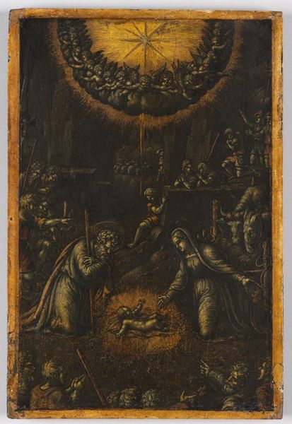 Curator: Looking at this Byzantine icon painting, it feels like peering through a darkened window into another dimension. So dense and dramatic! Editor: Absolutely. What strikes me immediately is the solemn mood. There's a sense of weighty authority, but also a kind of quiet drama in the way figures emerge from that rich, red background. Curator: This piece, entitled "The Council of Nicaea 787," believed to be painted between 1596 and 1605, captures a significant moment in religious history. Painted with tempera, its miniaturist detail reveals much. Editor: "Miniaturist" is right—look at the density of those tiny figures packed into the architectural space! It almost feels crowded, amplifying the idea of numerous opinions clashing for resolution. It has narrative weight, wouldn't you agree? Curator: It does, doesn't it? Note how they’ve organized the earthly and heavenly realms, unified by a sense of divine authority, and bound by symbol. It conveys continuity from heaven to Earth. Editor: It's true. Symbols aren't static, and I wonder how interpretations have shifted. But also... Does anyone else feel like Byzantine art occasionally makes figures look like they are attending the world’s longest and most serious potluck picnic? All that solemnity juxtaposed against an impossibly long table. Curator: (laughs) A provocative perspective! But in all seriousness, that “table,” the architectural space, functions to denote authority. So yes, like a very serious, sacred…meeting. Editor: Precisely! I mean, maybe my mind just wandered... but coming back around, I think what’s striking is the work is deeply impressive in how it fuses narrative, symbolism, and emotion, creating a rich and evocative depiction of this pivotal historical moment. Curator: It captures so much cultural and religious legacy—not just the historical event but an enduring visual language, resonating across centuries. Editor: I think my eye now appreciates the ways an image may alter—the stories we now project onto it that evolve over time. So fascinating, even when picnic thoughts invade!
