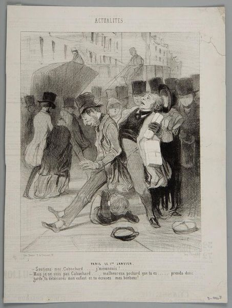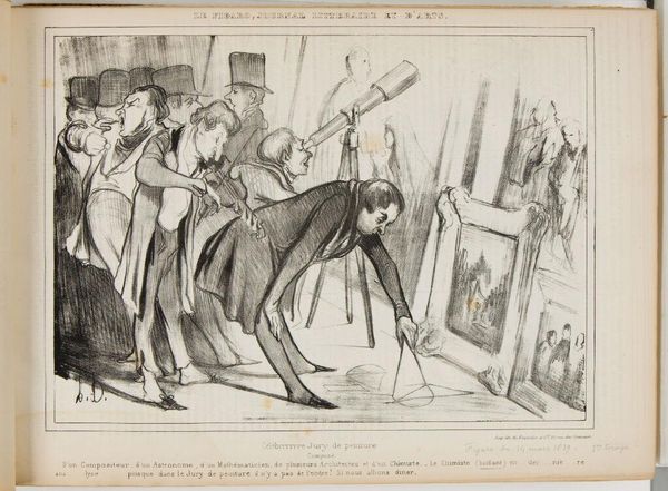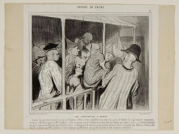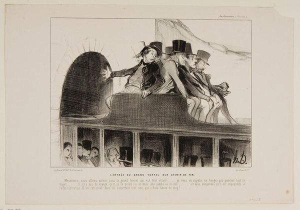 Curator: This is Honoré Daumier's "Charivari Parade," a work of great graphic energy. The initial impression is one of frenetic activity, isn't it? Editor: Absolutely. The chaotic lines and dense composition create a sense of unease. It feels almost like a visual cacophony. But what's the context here? Curator: Daumier was deeply engaged with social and political critique. "Charivari" refers to a raucous folk custom, a mock serenade expressing disapproval. This print satirizes the bourgeoisie and the political elite of his time, using caricature to undermine their authority. Editor: The figures on the platform, with their instruments, seem to embody this ridicule. But notice how Daumier uses light and shadow to create depth, drawing our eye to specific details. The formal arrangement reinforces the message. Curator: Daumier was a master of lithography; his prints circulated widely, challenging established power structures and giving voice to the disenfranchised. He was censored and imprisoned for his work. Editor: So, beyond its aesthetic qualities, this print is a powerful act of defiance. I appreciate this deeper understanding of the work. Curator: Indeed, it's a potent reminder of art's capacity to challenge the status quo.