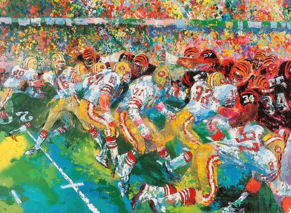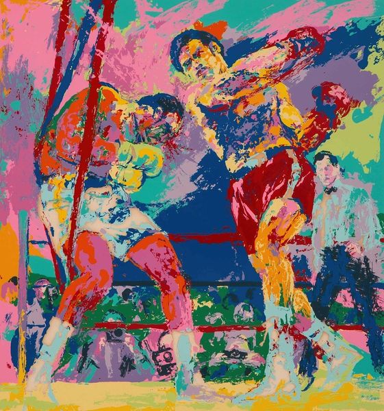 Curator: Let's consider LeRoy Neiman's “Baseball Game,” painted around 1980. What strikes you first? Editor: It's a vibrant explosion! The colours feel almost fauvist. I immediately get a sense of energy, of chaotic, exhilarating action. There’s this sense of frenetic movement— it feels raw, unfiltered. Curator: Neiman was certainly capturing a moment of explosive energy, but I see more than just raw energy here. There is an entire established career. A huge public role with a global and very well-documented one at that. How much can that role shape how the image works? Editor: You're right; it’s definitely considered, deliberate. Even though the colours seem random, the players are identifiable. And the social element—the spectators, the expectation, the commercial context— it is really brought out by this impressionist technique. Curator: I agree. His work challenges established notions of representation, breaking down barriers and inviting audiences into the inner world of the stadium and its events. Editor: This painting really evokes the tensions in that setting: between spectacle and authenticity, play and performance. There’s something to be said about who and how it allows you to witness it. Who exactly, gets this viewing vantage point? Curator: Precisely! It pushes back against established artistic hierarchies, prioritizing individual expression. Neiman’s own fame and acceptance in commercial media had an important place here. His approach was about capturing the immediate, unedited experience. Editor: Thinking about representation and access to visibility – this kind of vibrant expression also serves as a great celebration of athleticism, one that resonates deeply, even now. Neiman doesn't just depict a game; he distills the joy of being immersed in sport. Curator: Exactly, and it is the synthesis of all these layers and context. It isn’t just visual appeal but this invites ongoing dialogues about sport, culture, and what it means to connect across boundaries through the power of shared human experiences. Editor: Neiman certainly immortalized this human energy! It is so fitting to end on that note: that connection he fostered between people is a story well told here.