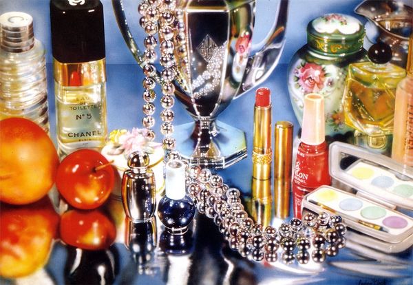 Editor: We’re looking at Audrey Flack’s still life, "Parrots Live Forever," made using mixed media incorporating photography, c-print, and glass elements. It's strikingly opulent, almost excessive with its array of objects. How would you interpret this arrangement? Curator: Flack, deeply influenced by Pop Art, engages with the Vanitas tradition in a provocative way. Still lifes are typically symbolic reminders of mortality. How does Flack both embrace and subvert that tradition, considering the context of its making, the consumerist boom, and the rising status of female artists who took imagery and presentation control of their own work? Editor: I see the connection to traditional still lifes, but the vibrancy feels like the opposite of those somber reminders. Curator: Precisely! This abundance challenges the traditional restraint, almost parodying it, and using new approaches with photo-realist sensibilities. It directly questions who this art is made for and how it's intended to circulate in the culture industry. This abundance screams against the usual lessons in temperance, doesn’t it? Think about how advertising also changed rapidly to become more assertive as well. How do you see the role of photography fitting into that message? Editor: The realism brought in through the photography and the glossy finish seem to highlight the artificiality of it all, but it feels real at the same time. Curator: It's a reflection of constructed realities, mass media, and a deliberate attempt to blur the lines between ‘high’ and ‘low’ art, and this commentary resonates profoundly even today as social media has altered many traditions and aesthetics, including that of self-representation and the still life itself. It encourages questioning of how we consume and assign meaning to imagery within consumer culture. Editor: I never really thought about Pop Art having ties to artwork from centuries prior, it has me considering it from a different angle now. Curator: That intersection—linking art history to contemporary visual culture—reveals just how much art is always in conversation with its predecessors and surrounding socio-political forces.