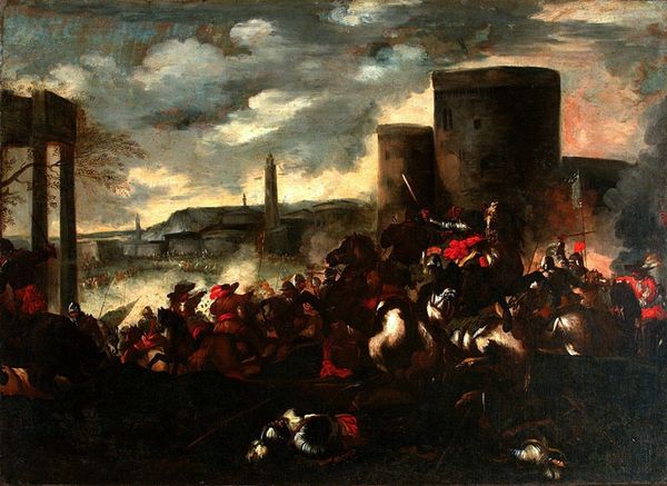 Curator: Immediately, I see movement and a sense of great conflict unfolding. It’s dynamic and visually very charged, but also… kind of romantic? Editor: I agree. We're looking at "David Antonio Manocada repulses Caberra," an oil painting likely dating from the Baroque period. The artist, David Teniers the Younger, really captures the energy of warfare, but presents a historical event with mythological weight through symbolic detail. Curator: You know, the ornamental frame surrounding the central image adds so much to the painting's feel; flowers, cherubs, armour. The emblems of war alongside the delicate, natural beauty create such a strange duality. Are these symbolic nods to conquest and its cost? Editor: Precisely. It situates the historical scene of the battle within broader themes of power and fragility. Teniers juxtaposes violence with emblems of refinement to probe power structures, depicting not just a clash of arms but also a clash of cultures. We have to consider, in this era, paintings often served purposes beyond mere decoration—functioning as tools to assert dominance. Curator: I see that in the posture of David Antonio Manocada, mounted high on that magnificent horse; that powerful pose conveys a lot of symbolism regarding military prowess. The image is not just about conflict, but the glorification of leadership. I wonder, do you find his dominance celebratory, or are there darker elements in its presentation? Editor: There's an interesting ambiguity, actually. While glorifying, the painting could inadvertently invite discourse about colonial implications and resistance efforts against power. Teniers leaves space for considering the consequences of dominance and the importance of questioning monolithic accounts of history. Curator: This interplay of power, symbols, and ambiguity feels very relevant to understanding historical perspectives and modern discourse alike. Editor: Absolutely, thinking critically about history means analyzing multiple layers—the ones on the canvas and beyond. The narrative that’s visibly available, and the narrative you need to seek.