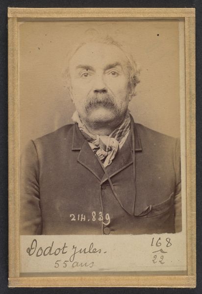 This photograph by Alphonse Bertillon, taken on March 16, 1894, captures Victor Deguet, an armorer labeled as an anarchist. The mugshot, a stark and systematic approach to identifying individuals, is full of symbols that hint at broader cultural anxieties. Look closely at the act of cataloging a face. It reminds me of ancient practices of physiognomy, where one's character was read through their features. This pseudo-science, though discredited, has roots stretching back to antiquity and resurfaces in various forms throughout history. Deguet's fixed stare and the rigid structure of the photograph invoke intense scrutiny. It's as if his very essence is being dissected and judged. There is a deep-seated fear here. What emotions does this image trigger in you? What power does a single face, captured and classified, hold? Such images of men deemed dangerous, connect to collective memories and subconscious fears. It brings to mind the cyclical progression of social anxieties, where "deviant" figures are studied, feared, and symbolically ostracized across generations.