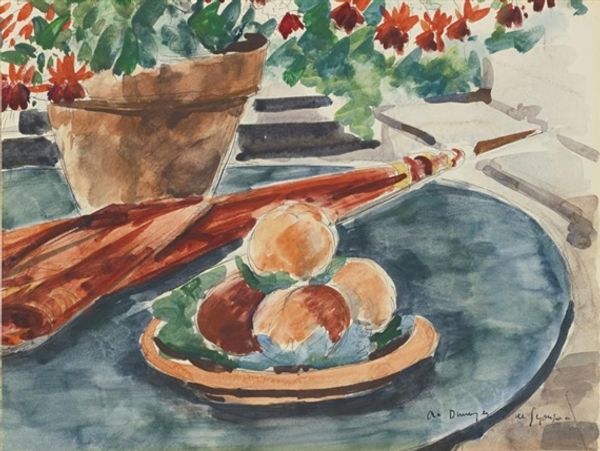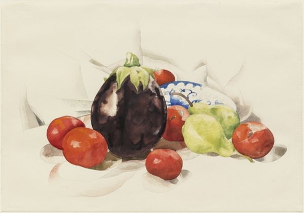 Curator: Charles Demuth painted "Fruit and Daisies", now at the Harvard Art Museums, using watercolor on paper. Editor: There's a softness to it, almost hazy, but grounded by those strong geometric shapes in the drapery. Curator: Demuth, a key figure in Precisionism, often explored the intersection of modern art and commercial design, subtly critiquing industrialization's impact. Editor: The way he reduces forms—the rounded fruit, the sharp angles of the cloth—it creates a fascinating tension. It's both representational and abstract. Curator: Indeed. Demuth, who identified as queer, coded messages in his work, challenging conventional ideas around beauty and sexuality. Editor: The subdued palette almost mutes the sensuality of the fruit, focusing instead on the interplay of light and shadow, the barest suggestion of form. Curator: Considering his social milieu, the watercolor might be understood as a subtle, almost clandestine act of defiance. Editor: It's an artwork that invites us to consider both its formal qualities and its social context. Curator: Precisely. A delicate dance between form and narrative.
