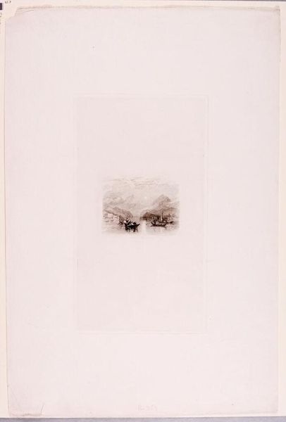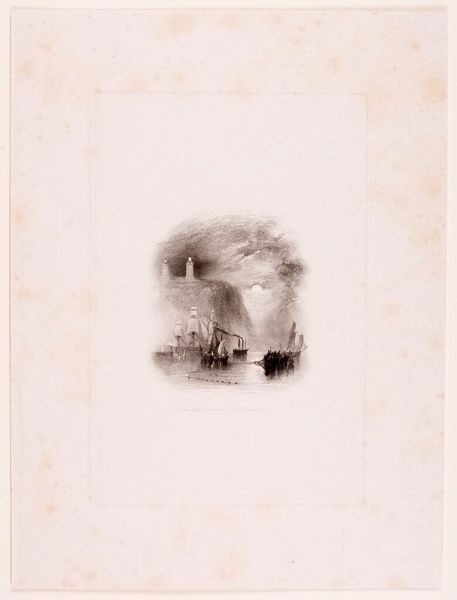 Editor: This is Edward Goodall's "Land Discovered by Columbus," housed here at Harvard. It's quite small and dark, a little unsettling. What do you see in this piece? Curator: The very title is loaded. "Discovery" implies a void, erasing the Indigenous presence already there. The darkness, the ship looming under a crescent moon... it speaks to the violence inherent in this so-called discovery. Consider the flags raised on the ship, they are not neutral symbols, but declarations of ownership and power. Editor: So, it's not just a historical scene, but a critique? Curator: Precisely. Goodall might be subtly questioning the narrative of heroism surrounding Columbus. What do you think this piece can teach us today? Editor: That history isn't always what it seems. And that art can reveal uncomfortable truths. Curator: Exactly. It invites us to critically examine whose stories are told and whose are silenced.