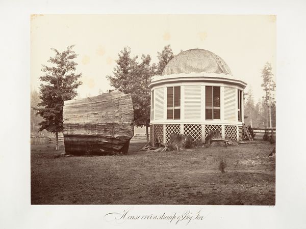 Carleton Watkins made this photograph, 'The House Built over the Stump of a Big Tree,' using albumen silver print. Here, we are confronted with a stark contrast: a felled giant redwood, its rings exposed like an open wound, placed alongside a delicate, almost doll-like house with latticework and a rounded roof. The composition splits the space between natural decay and human artifice. The textures play against each other - the rough, organic patterns of the tree stump against the smooth, geometric precision of the house. The photograph destabilizes our conventional understanding of nature and culture. It challenges the romanticized view of progress, suggesting that development comes at the cost of environmental destruction. This juxtaposition reveals a commentary on scale, perception, and the human impact on landscape. The sepia tones add a layer of nostalgia, perhaps hinting at the irreversible changes brought about by settlement. This work serves as a powerful signifier of the complex relationship between humanity and the natural world.