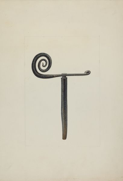 Editor: We're looking at a drawing from around 1938 by Ralph Russell, titled "Iron Bracket from Zoar Tavern." It’s rendered in watercolor, a humble yet charming medium. What strikes me is the way it captures this ordinary, everyday object, almost like a portrait. What do you see in it? Curator: It's got this delightful utilitarian elegance, doesn’t it? Imagine that bracket, likely forged with fire and sweat, holding up something of equal weight – perhaps a lantern illuminating stories and secrets whispered in the tavern. The artist sees the beauty in its bare necessity. There’s an intimacy in rendering metal with watercolor; it's an act of affection. Does it spark anything in you? Editor: Yes, that's a lovely image. The soft watercolors soften what could be harsh iron. I also see this almost haunting absence. We have the bracket but none of the other objects or activity within the Tavern. Curator: You're right, there's a poignancy to its solitude on the page. It is a symbol – not just of the tavern but also the craftsmanship, the community, perhaps even the disappearing way of life of that era. You wonder what other stories this humble object could whisper if it could speak! Editor: It's funny, I hadn't thought about it that way. So it’s not *just* an iron bracket? It makes you wonder about its context. Curator: Exactly! It transcends its physical form and becomes a little vessel of history. We pour our imaginations into it and it comes to life. Editor: Thanks so much, this really gave me a new way to appreciate this artwork. Curator: My pleasure! Isn't it fascinating how everyday objects, rendered with intention, can become portals to the past?